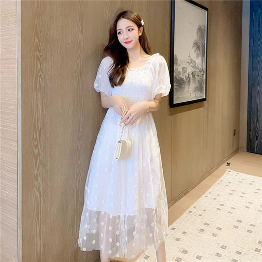 2021 Mùa Hè Hàn Quốc Nữ Váy Đầm Hoa Chém Cổ Trắng Xanh Thêu Lưới Đi Biển Đầm Thanh Lịch Nữ Tính Tay Phồng Đầm Midi